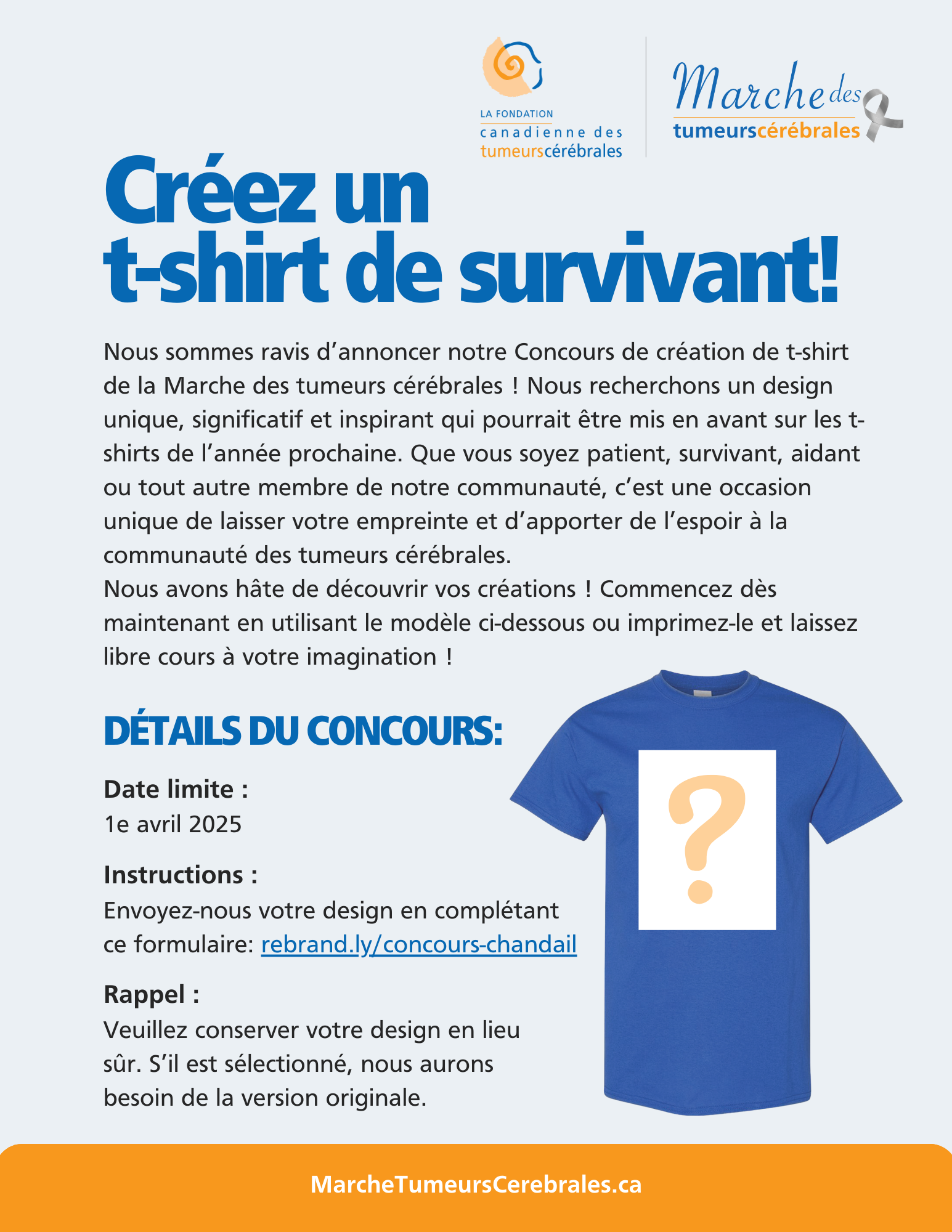 Nous sommes ravis d’annoncer le Concours de design du t-shirt de la Marche des tumeurs cérébrales ! Nous recherchons un design unique, significatif et inspirant qui pourrait être imprimé sur nos t-shirts l’année prochaine. Que vous soyez patient, survivant, aidant ou tout autre membre de la communauté, c’est l’occasion de laisser votre empreinte et d’apporter de l’espoir aux personnes touchées par une tumeur cérébrale.