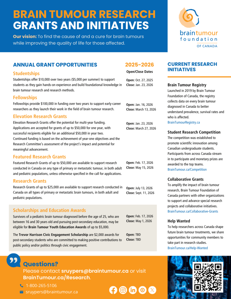 Discover how Brain Tumour Foundation of Canada is advancing research and innovation through current grants and funding opportunities that drive progress toward improved treatments and a cure.