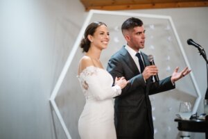 Ewen and Kendall graciously requested donations to Brain Tumour Foundation of Canada at their October 2024 wedding, with their emcees—Ewen’s brothers—collecting cash for every clink of the glass, signaling for the couple to kiss.